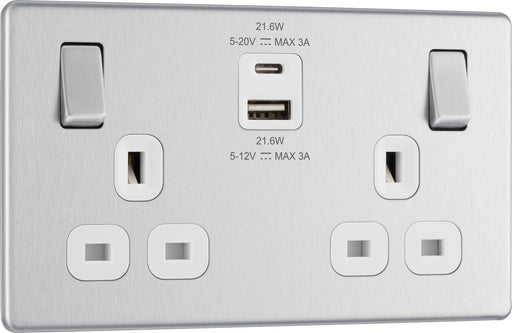 BG FBS22UAC22W Flatplate Screwless 13A Double Switched Power Socket + USB A+C (22W) - Brushed Steel + White Insert