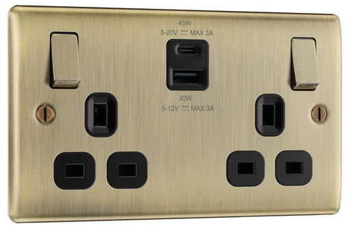 BG NAB22UAC45B Nexus Metal 13A Double Switched Power Socket + USB A+C (45W) - Antique Brass + Black Insert