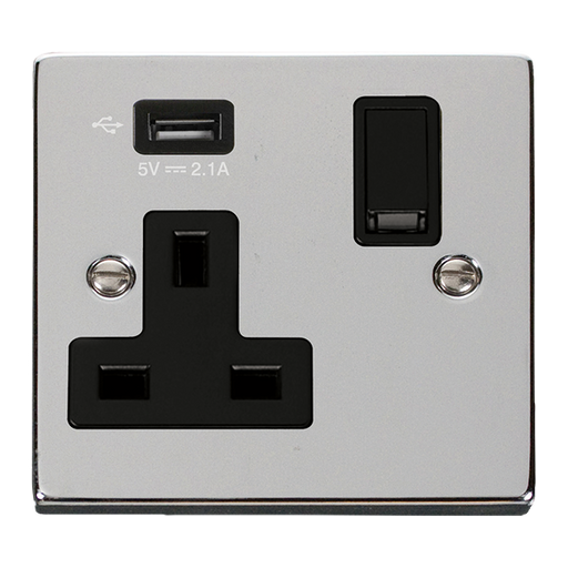 Click Deco VPCH771UBK Victorian 13A 1G Switched Socket + 1x2.1A USB - Polished Chrome (Black)