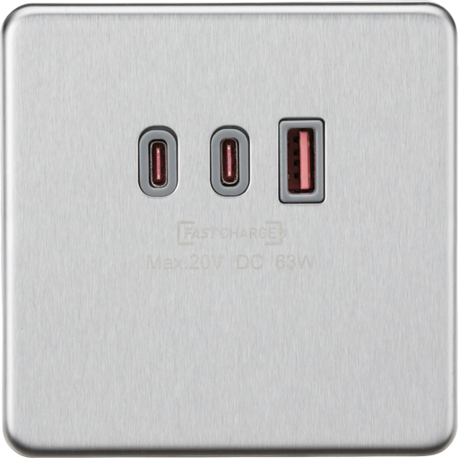 Knightsbridge SFR9919BCG Screwless 13A 1G Switched Socket + 2xUSB (A+C) FAST - Brushed Chrome + Grey Insert