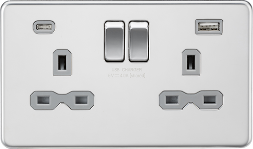 Knightsbridge FPR9940PCG Flat Plate 13A 2G SP Switched Socket + 2xUSB A+C (5V DC 4.0A Shared) - Polished Chrome + Grey Insert