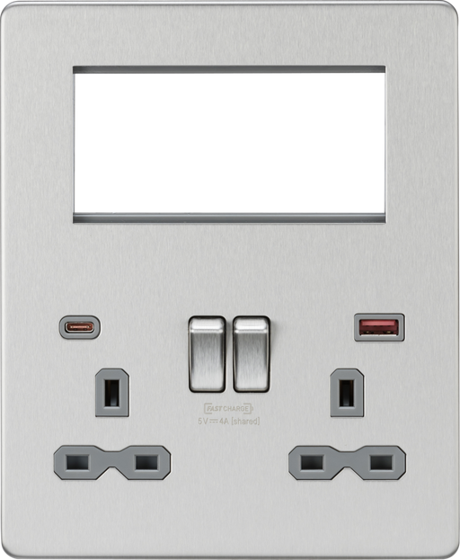 Knightsbridge SFR992RBCG Screwless 13A 2G DP Socket + 2xUSB (A+C) FAST + 2G Modular Combination Plate (L) - Brushed Chrome + Grey Insert