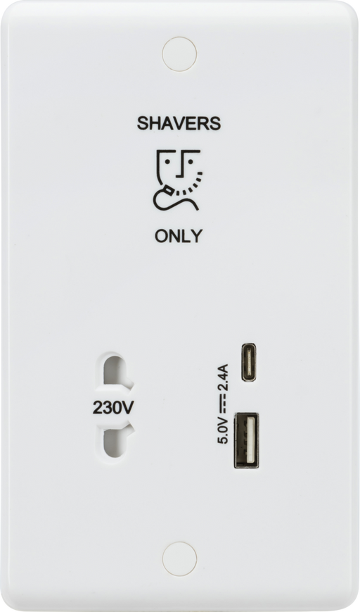 Knightsbridge CU8909 White Curved Edge 230V Shaver Socket with Dual USB A+C (5V DC 2.4A Shared, Max. 12W)