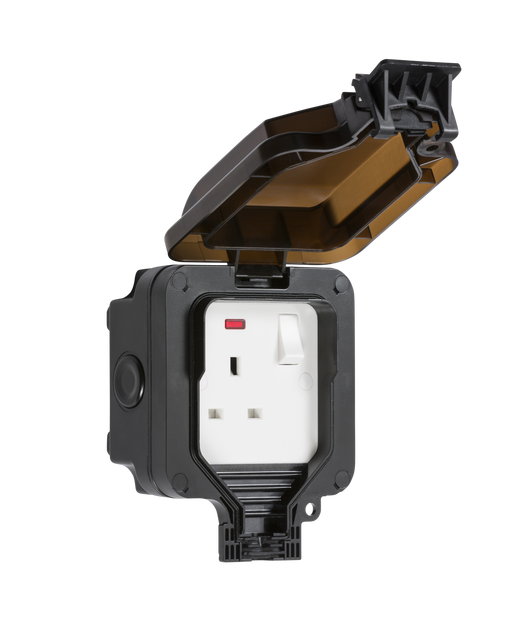 Knightsbridge OP7N Weatherproof IP66 13A 1G DP Switched Socket + Neon – Black The Knightsbridge OP7N Weatherproof Switched Socket is a durable outd...