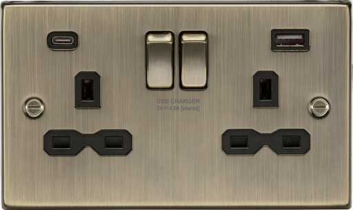Knightsbridge CS9940AB Square Edge 13A 2G SP Switched Socket with Dual USB A+C (5V DC 4.0A Shared) – Antique Brass + Black Insert The Knightsbridg...