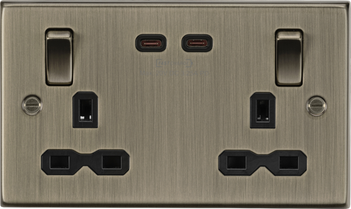 Knightsbridge CS9965AB Square Edge 13A 2G DP Switched Socket with Dual USB-C (65W DUAL FASTCHARGE) - Antique Brass + Black Insert