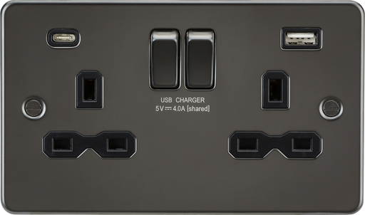Knightsbridge FPR9940GM Flat Plate 13A 2G SP Switched Socket + 2xUSB A+C (5V DC 4.0A Shared) - Gunmetal + Black Insert