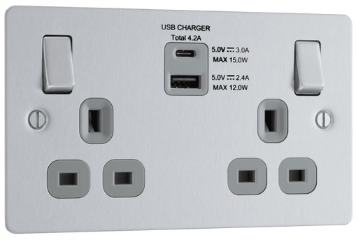BG SBS22UACG Flatplate Screwed 13A Double Socket + USB A+C(4.2A) - Grey Insert - Brushed Steel Flatplate Screwed Decorative Wiring Accessories Our...
