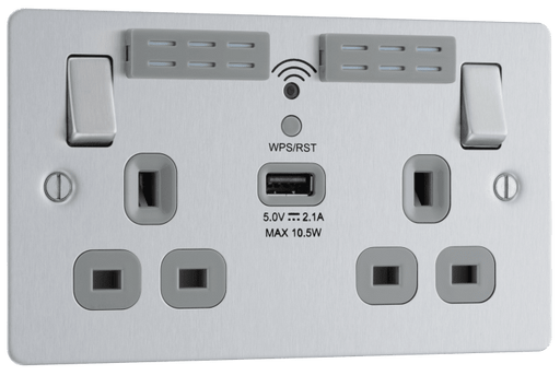 BG SBS22UWRG Flatplate Screwed 13A Double Socket + Wifi Extender +1x USB(2.1A) - Grey Insert - Brushed Steel
