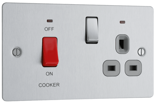 BG SBS70G Flatplate Screwed 45A DP Cooker + Socket + Neon - Grey Insert - Brushed Steel Flatplate Screwed Decorative Wiring Accessories Our slimli...