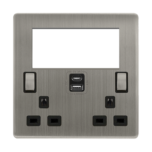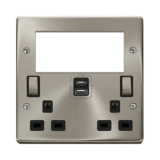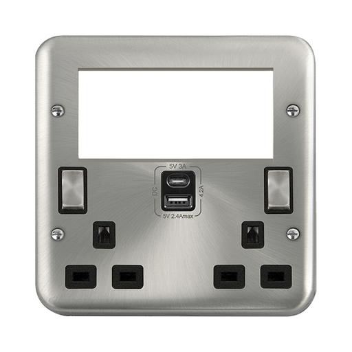 Click Deco Plus DPSC684BK 2 Gang 3 Pin Safety Shutter Type A & C USB Switched Socket with Quad New Media Apertures - Satin Chrome (Black)