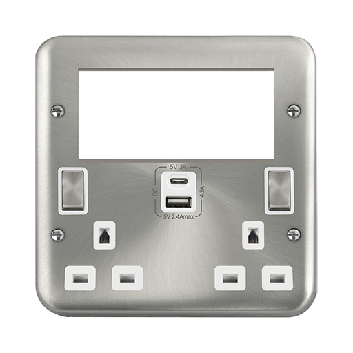 Click Deco Plus DPSC684WH 2 Gang 3 Pin Safety Shutter Type A & C USB Switched Socket with Quad New Media Apertures - Satin Chrome (White)
