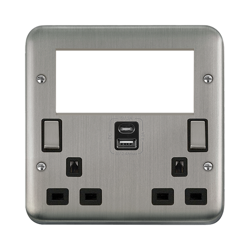 Click Deco Plus DPSS684BK 2 Gang 3 Pin Safety Shutter Type A & C USB Switched Socket with Quad New Media Apertures - Stainless Steel (Black)