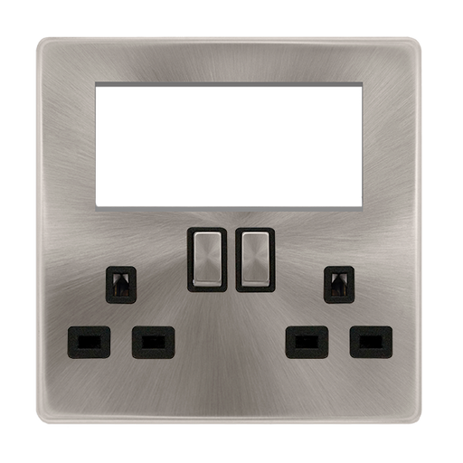 Click Definity Complete SFBS604BK 2 Gang 3 Pin Safety Shutter Switched Socket with Quad New Media Apertures - Brushed Steel Cover Plate - Black Insert