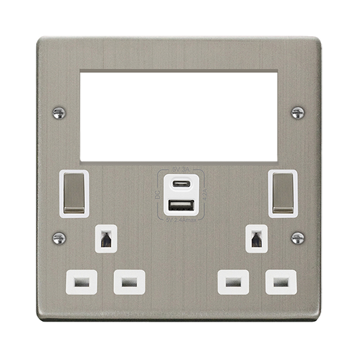 Click Deco Victorian VPSS684WH 2 Gang 3 Pin Safety Shutter Type A & C USB Switched Socket with Quad New Media Apertures - Stainless Steel (White)