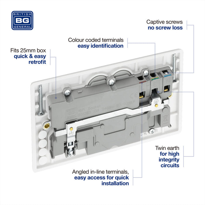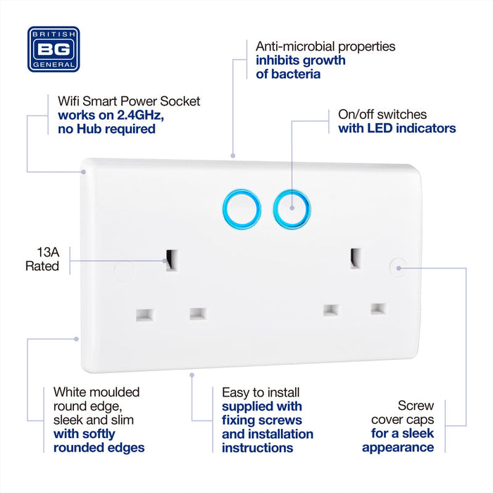 BG White Moulded Slim Double Switched 13A Power Socket with Smart Home Control