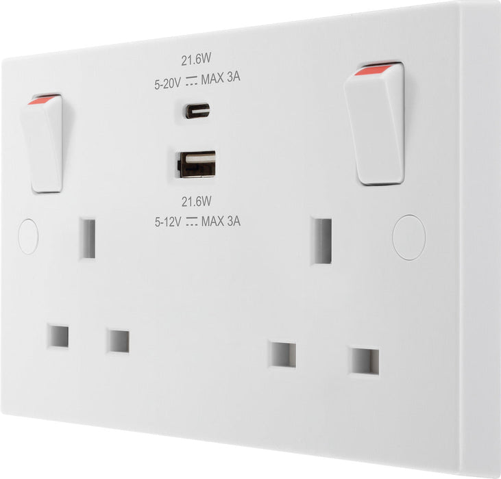 BG 922UAC22 White Square Edge 13A Double Switched Power Socket + USB A+C (22W)
