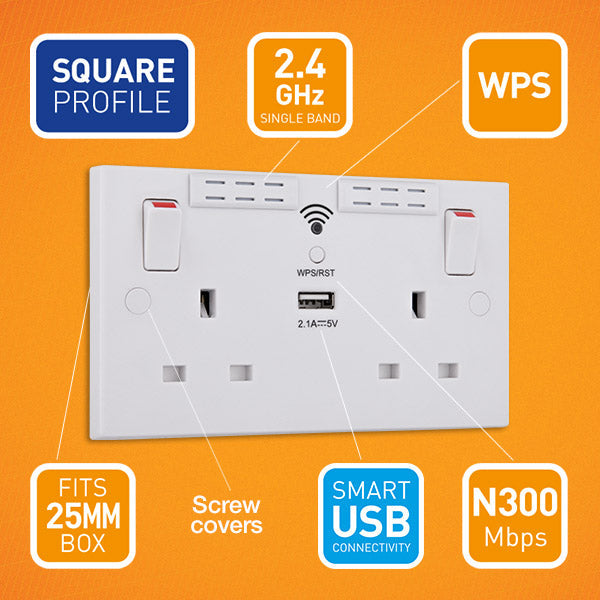 BG White Square Edge 13A Double Socket + Wifi Extender +1x USB(2.1A)