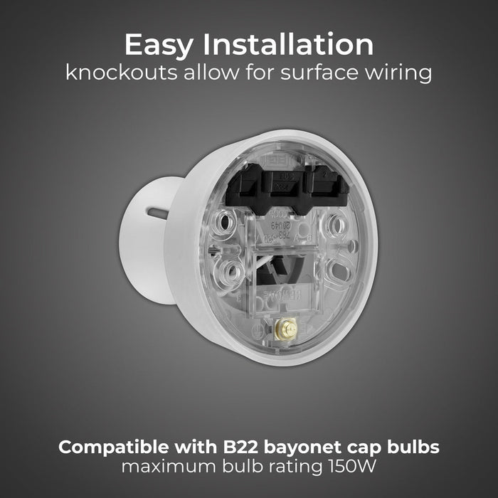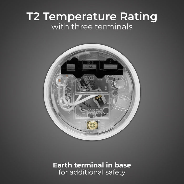 The BG 763 Enclosed Batten Holder from British General is a robust and reliable solution designed for safety and convenience. T2 rated and pre-wired with heat-resistant PVC tails, this enclosed lamp holder is suitable for use with B22 bayonet cap bulbs. The base includes L, N and Loop-in terminals, a large capacity earth terminal with a locking screw, and eight individual cable entries to support flexible wiring needs.