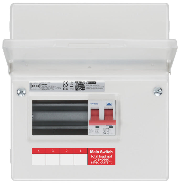 BG Fortress CF6M4 6 Module 4 Way Unpopulated Metal Consumer Unit with 100A Main Switch
