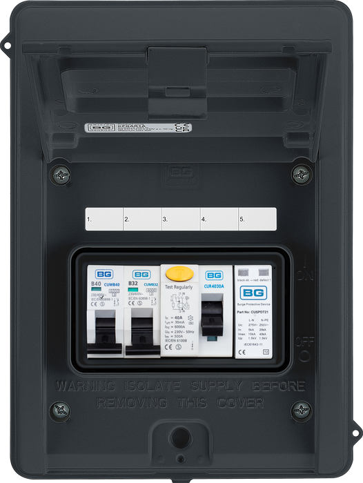 BG CFEV1A IP65 Weatherproof Metal EV Charger Circuit Protection with 40A 30mA Type A RCD, 40A B Curve MCB & Type 2 SPD