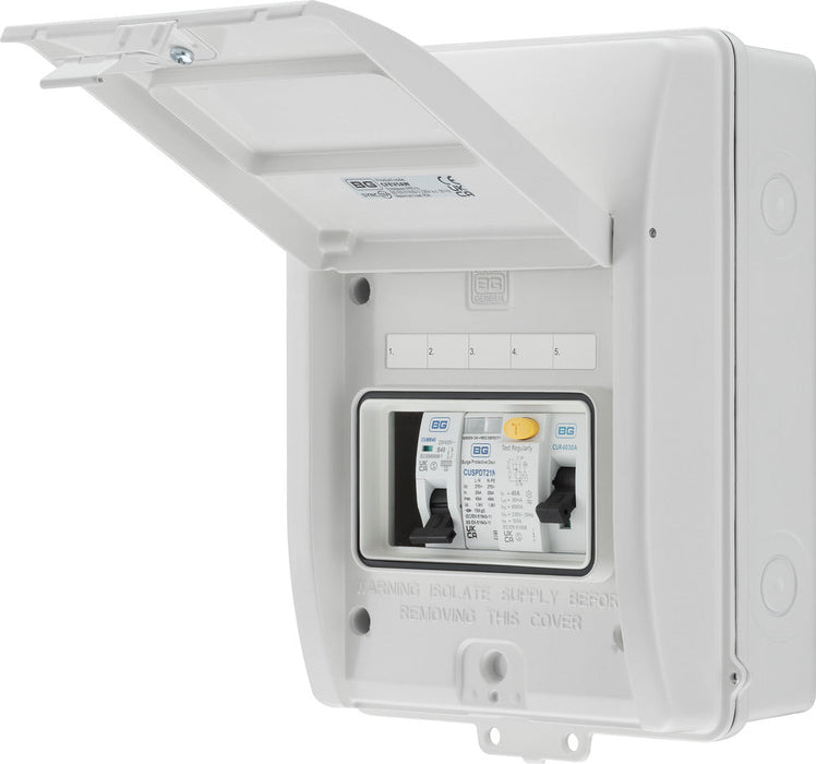 BG CFEV5AW 5 Module IP65 Weatherproof White Metal EV Charger Circuit Protection with 40A 30mA Type A RCD, 40A B Curve MCB & Type 2 SPD
