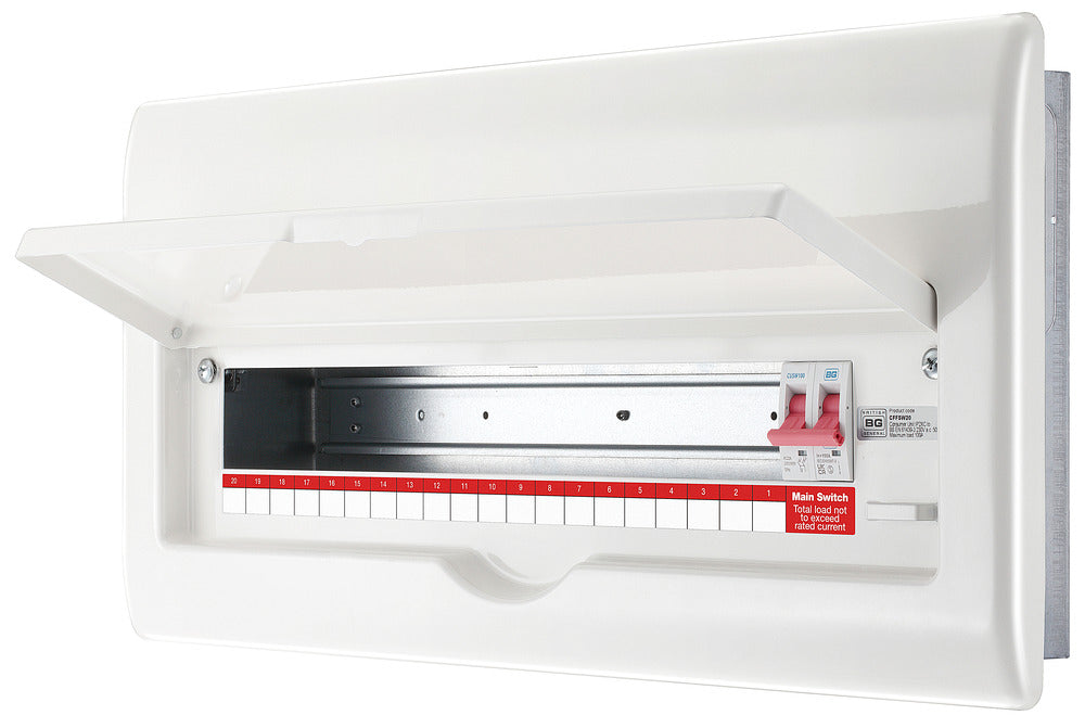 This item is 20 Way fully recessed consumer unit, 100A Main Switch