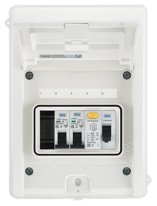 BG CFGAR1A Garage Kit - IP65 Metal Enclosure, 40A Type A 30mA RCD, 6+32A MCB