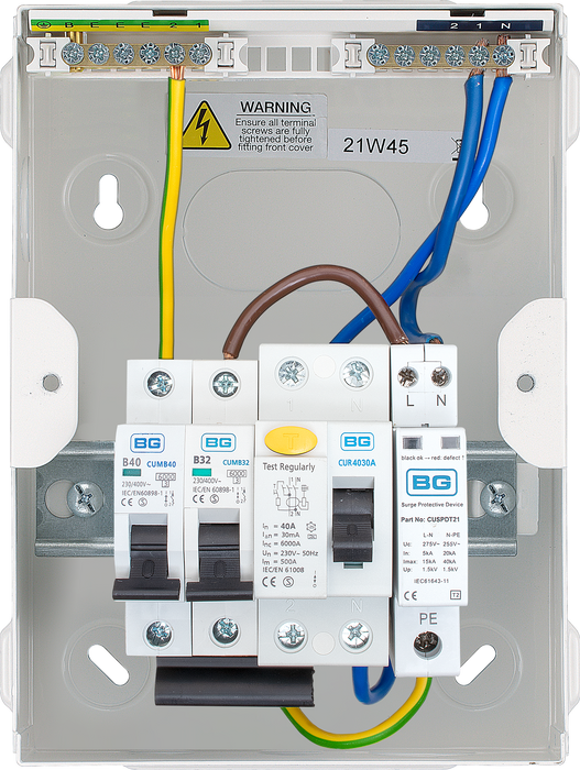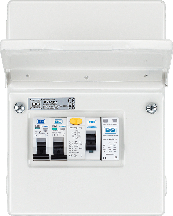 BG CFUEV1A IP20 Metal Metal EV Charger Circuit Protection with 40A 30mA Type A RCD, 40A B Curve MCB & Type 2 SPD