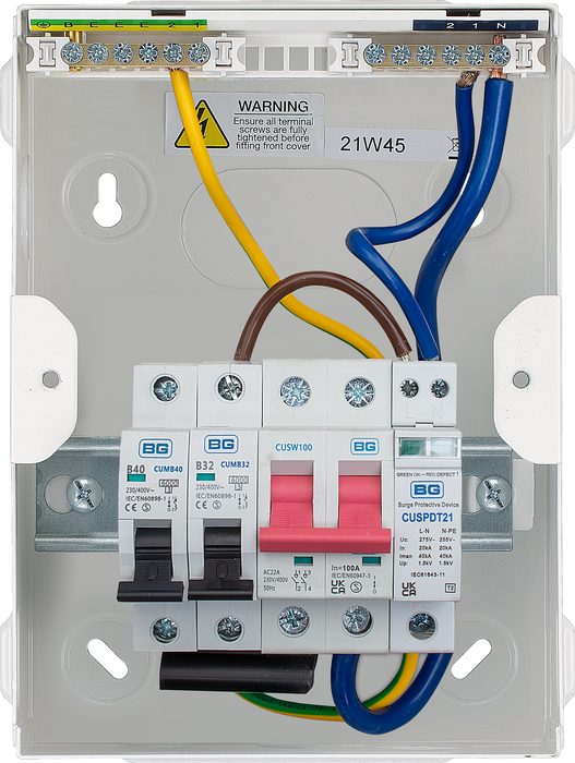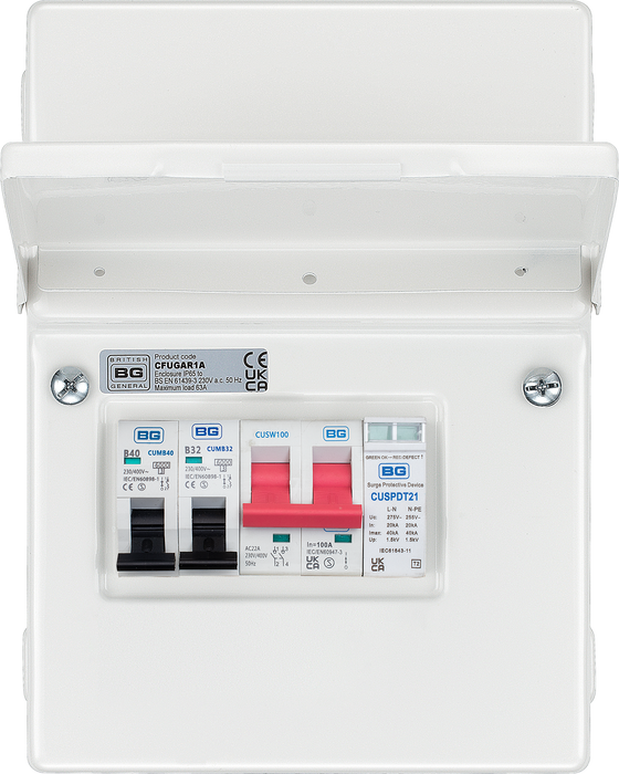 BG CFUEV2 IP20 Metal Metal EV Charger Circuit Protection with 100A Main Switch, 40A B Curve MCB & Type 2 SPD