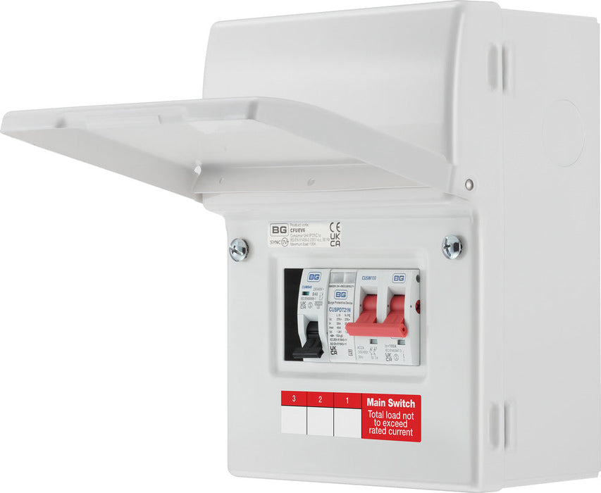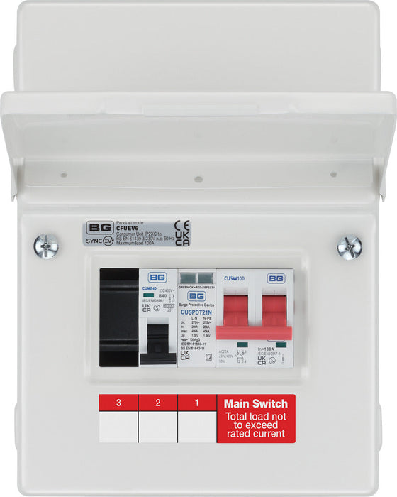BG CFUEV6 5 Module IP20 Metal Metal EV Charger Circuit Protection with 100A Main Switch, 40A B Curve MCB & Type 2 SPD