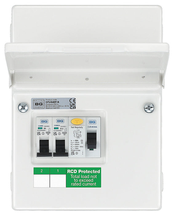 BG CFUGAR1A Garage Kit - IP20 Metal Enclosure, 40A Type A 30mA RCD, 6+32A MCB