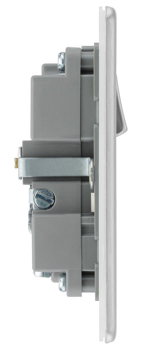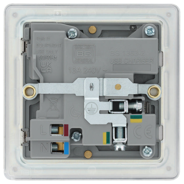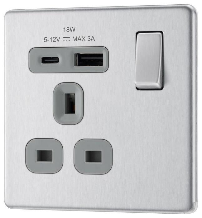 BG FBS21UAC18G Flatplate Screwless 13A Single Switched Power Socket + USB A+C (18W) - Brushed Steel + Grey Insert