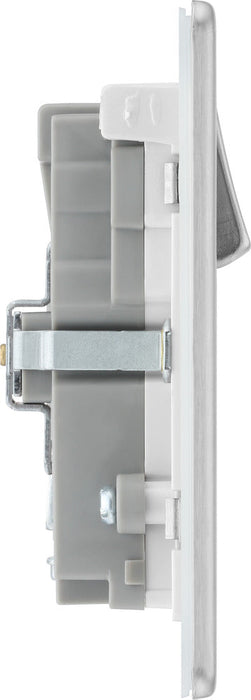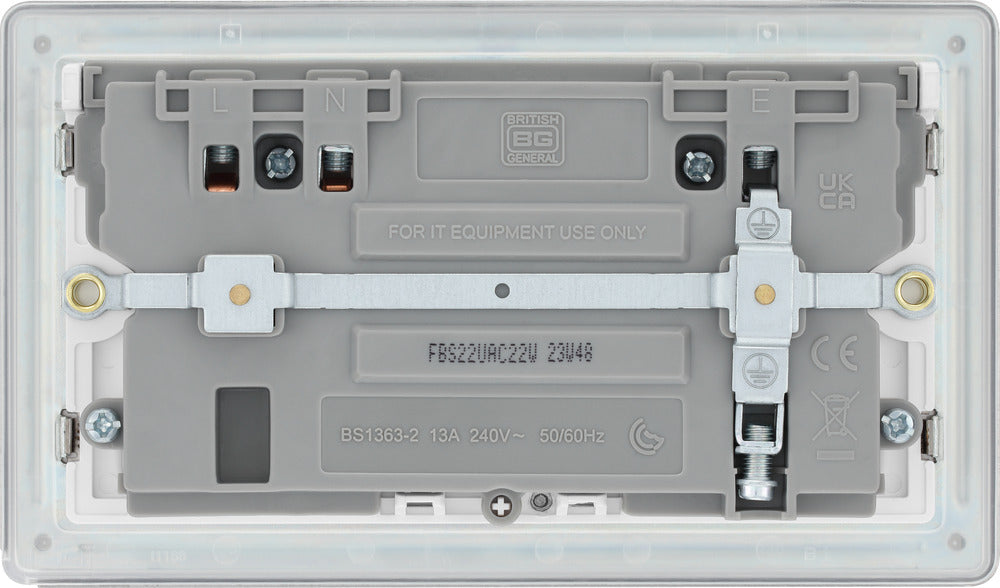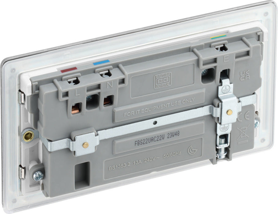 BG FBS22UAC22W Flatplate Screwless 13A Double Switched Power Socket + USB A+C (22W) - Brushed Steel + White Insert