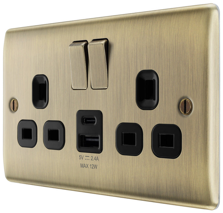 BG NAB22UAC12B Nexus Metal 13A Double Switched Power Socket + USB A+C (12W) - Antique Brass + Black Insert