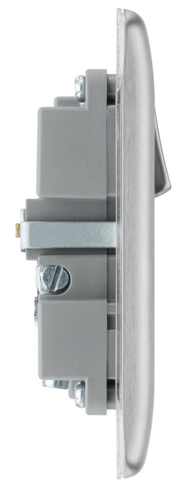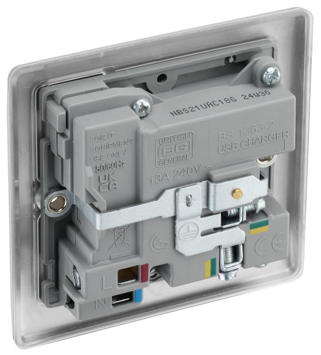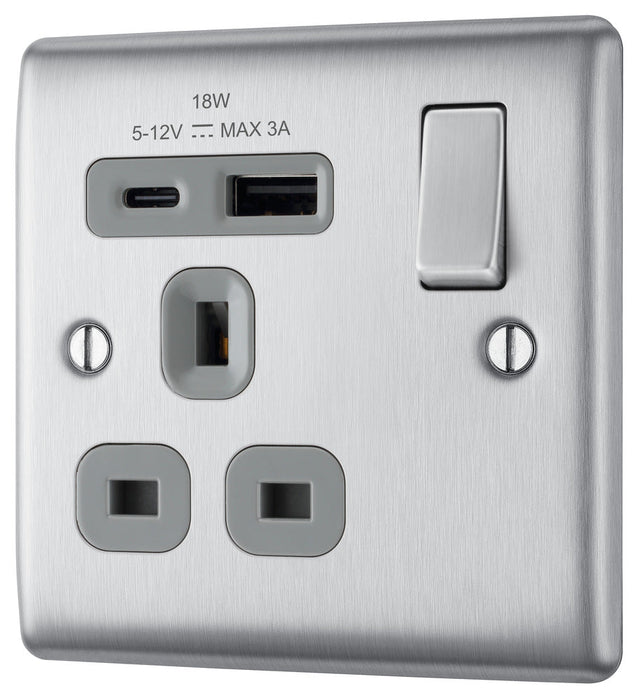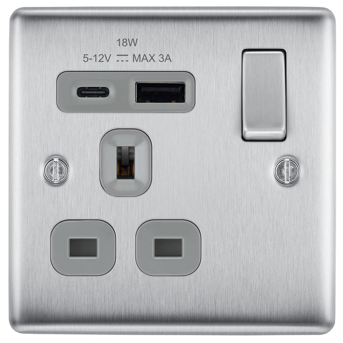 BG NBS21UAC18G Nexus Metal 13A Single Switched Power Socket + USB A+C (18W) - Brushed Steel + Grey Insert