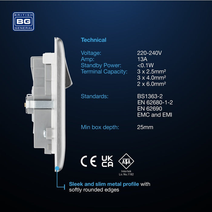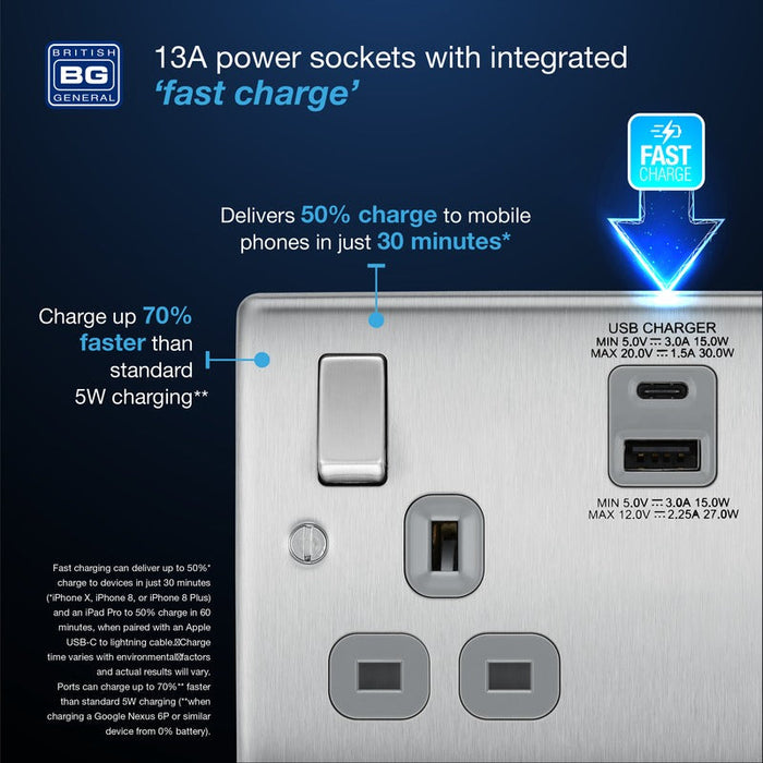 BG Nexus Metal 13A Double Socket + USB A+C (30W) - Grey Insert - Brushed Steel
