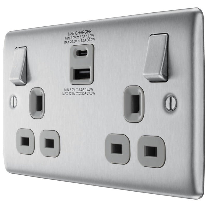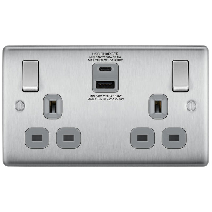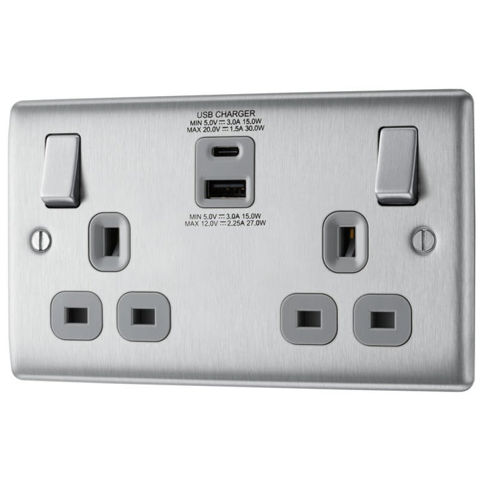 BG NBS22UAC30G Nexus Metal 13A Double Socket + USB A+C (30W) - Grey Insert - Brushed Steel