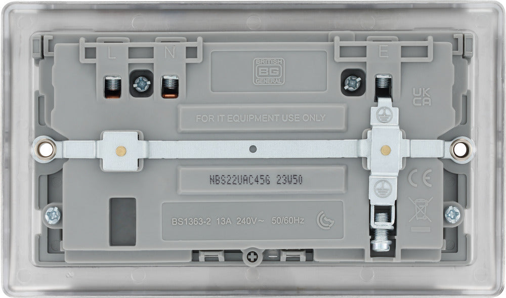 BG NBS22UAC45G Nexus Metal 13A Double Switched Power Socket + USB A+C (45W) - Brushed Steel + Grey Insert