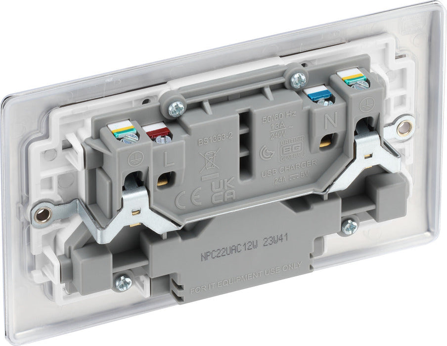 BG NPC22UAC12W Nexus Metal 13A Double Switched Power Socket + USB A+C (12W) - Polished Chrome + White Insert