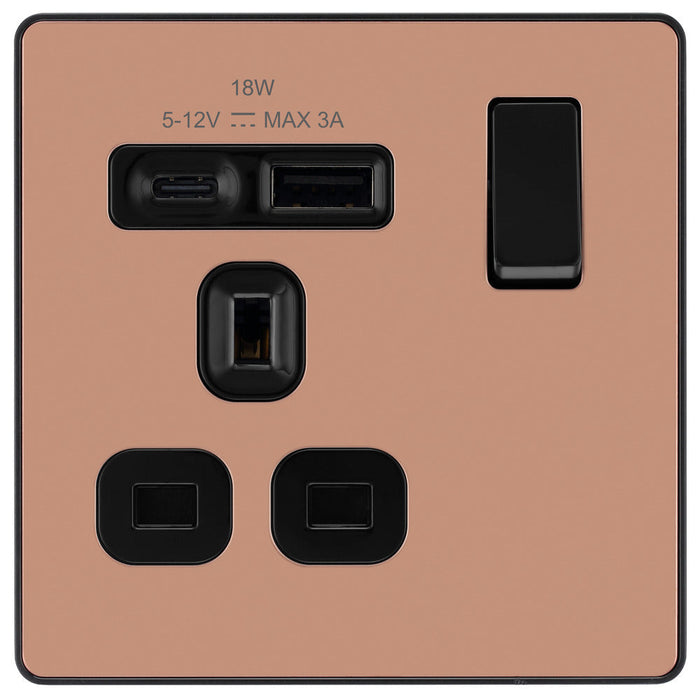 BG Evolve PCDCP21UAC18B 13A Single Switched Power Socket + USB A+C (18W) - Polished Copper (Black)