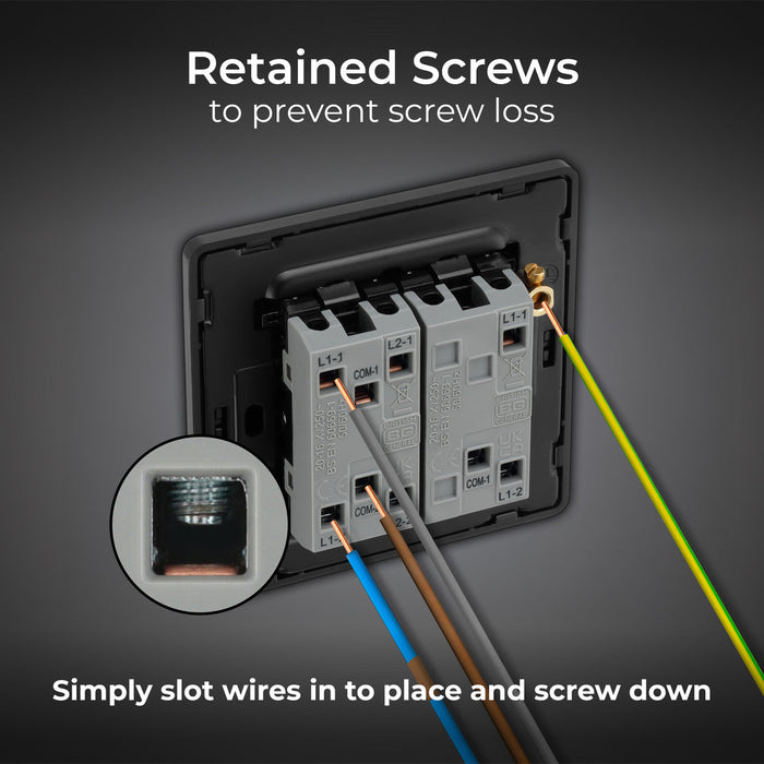 This Evolve 20A triple light switch from BG will operate three lights in a room. The 2 way switch lets a second switch be added to the circuit, allowing the customer to operate the same lights from another location, e.g. either side of a room, or top and bottom of the stairs. The low profile edge-to-edge rockers clip in to place once the base is installed for a screwless appearance, with a large touch surface for easy operation and brushed steel finish. Installation is fast and secure with clearly labelled captive backed out terminal screws. The switch is certified to BS60669-1 standards, and comes with a 25-year guarantee for total peace of mind. BG’s Evolve range of wiring accessories is available in a variety of colours and finishes to give you greater choice and flexibility when choosing electrical accessories.