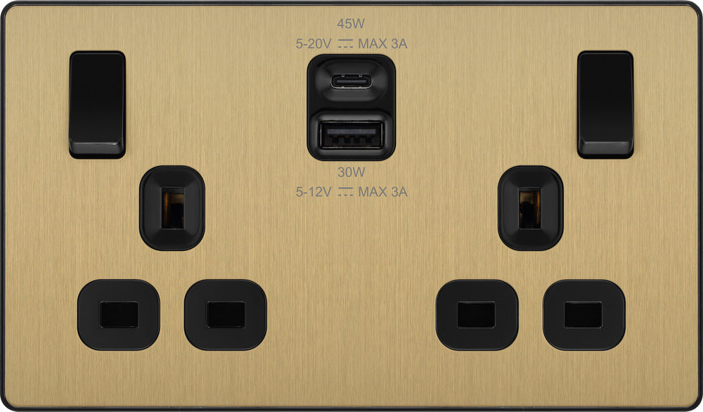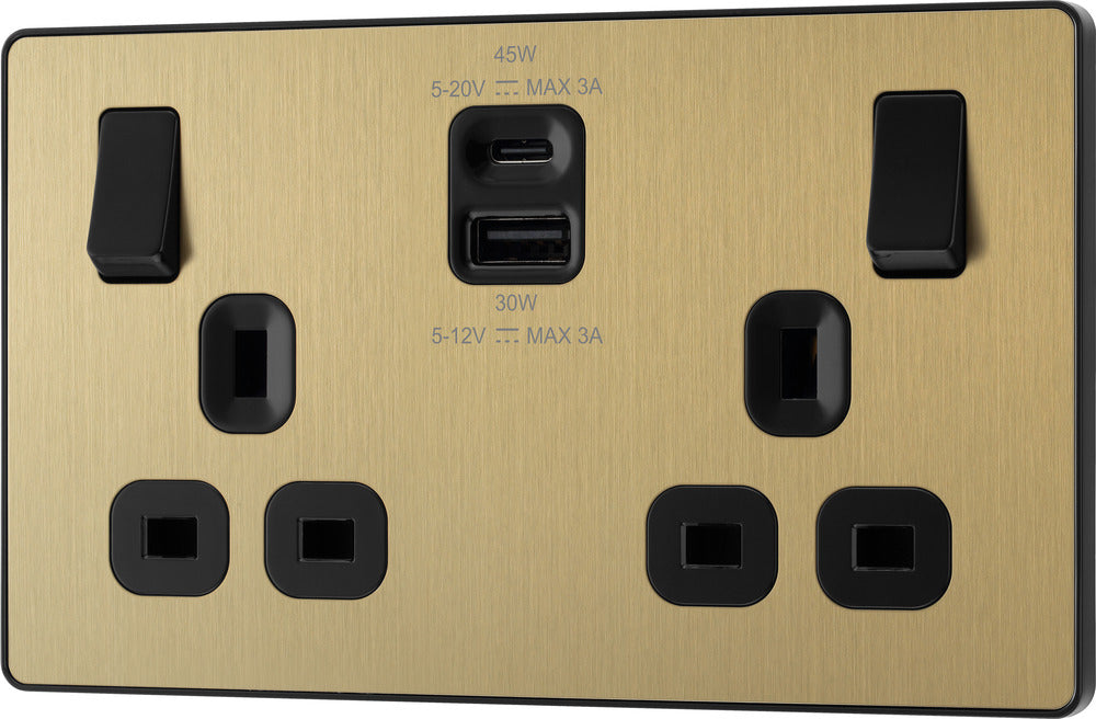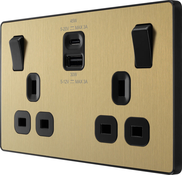 BG Evolve PCDSB22UAC45B 13A Double Switched Power Socket + USB A+C (45W) - Satin Brass (Black)