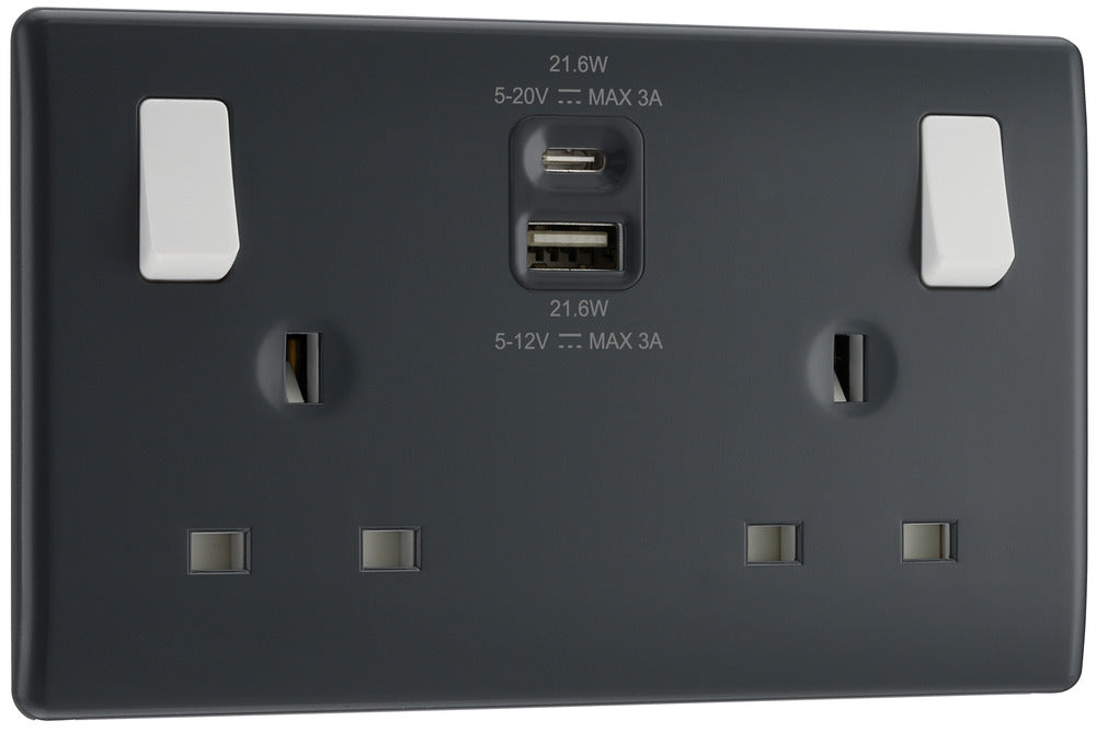 BG Part M PM22UAC22 13A Double Switched Power Socket + USB A+C (22W)