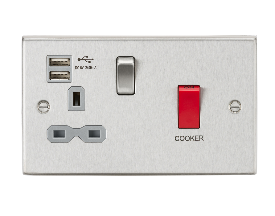 Knightsbridge CS8333UBCG Square Edge 45A DP Switch + 13A Switch Socket +2xUSB 2.4A - Brushed Chrome + Grey Insert