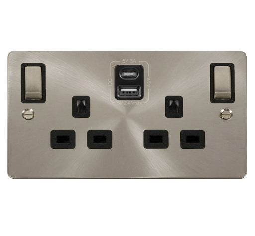 Click Define FPBS586BK Flat Plate 13A Ingot 2G Switched Socket + Type A&C USB - Brushed Stainless (Black)