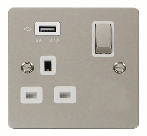 Click Define FPPN571WH Flat Plate 13A Ingot 1G Switched Socket with 2.1A USB Outlet - Pearl Nickel (White)