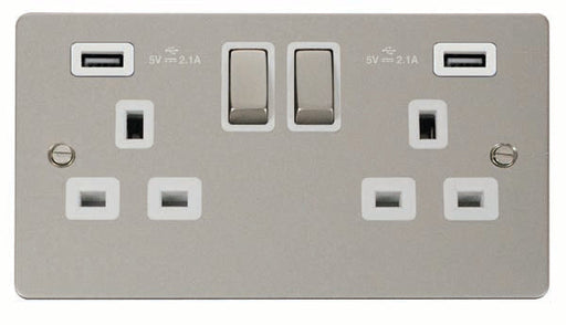 Click Define FPPN570WH Flat Plate 13A Ingot 2G Switched Socket + 1x2.1A USB - Pearl Nickel (White)