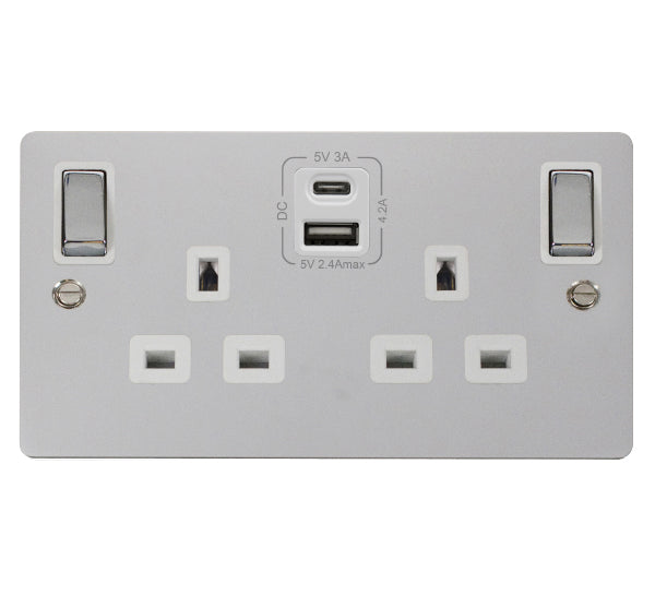 Click Define FPCH586WH Flat Plate 13A Ingot 2G Switched Socket + Type A&C USB - Polished Chrome (White)
