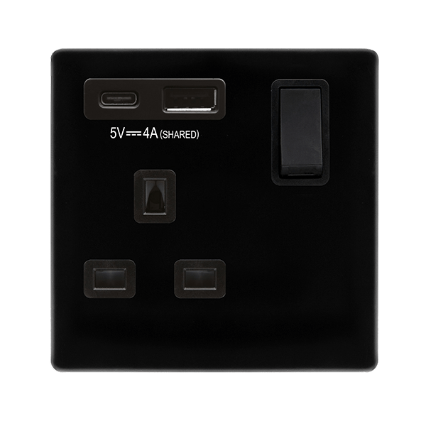 This item is Non Ingot' 13A 1 Gang Switched Safety Shutter Socket Outlet with Type A & C USB (4A) Outlets - Metal Black - Black Inserts